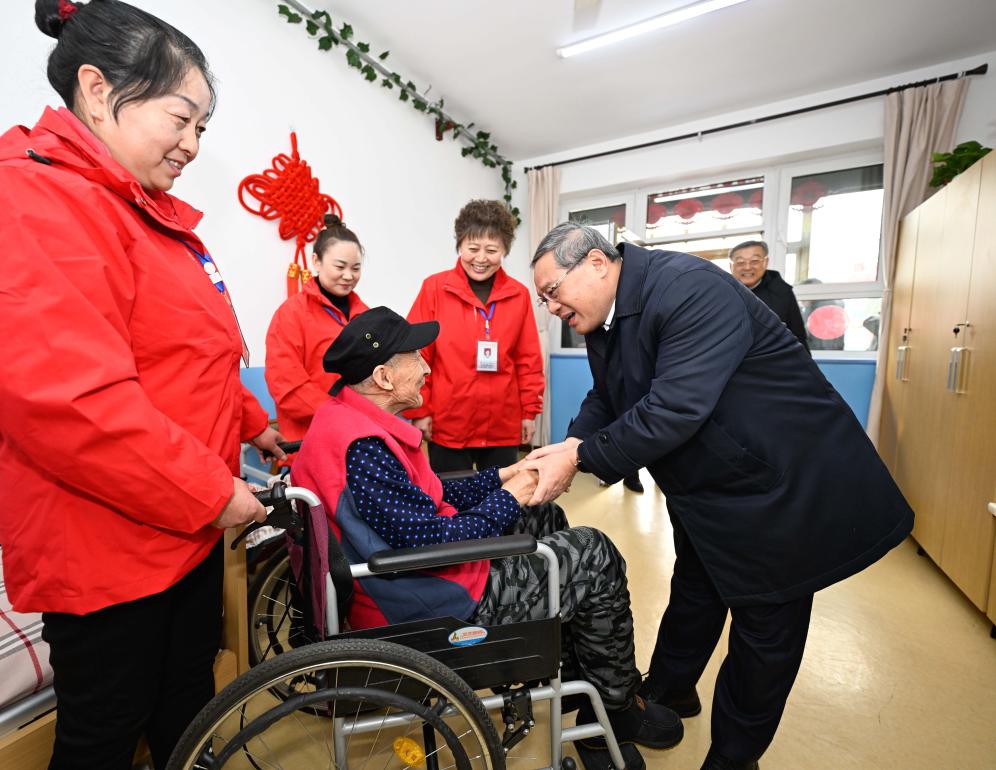 Chinese Premier Li Qiang, also a member of the Standing Committee of the Political Bureau of the Communist Party of China Central Committee, visits a nursing home in Taiyuan, north China's Shanxi Province, Feb. 1, 2024. Li visited primary-level government officials and ordinary people and extended Spring Festival greetings to them during an inspection tour in north China's Shanxi Province on Thursday. (Xinhua/Shen Hong)