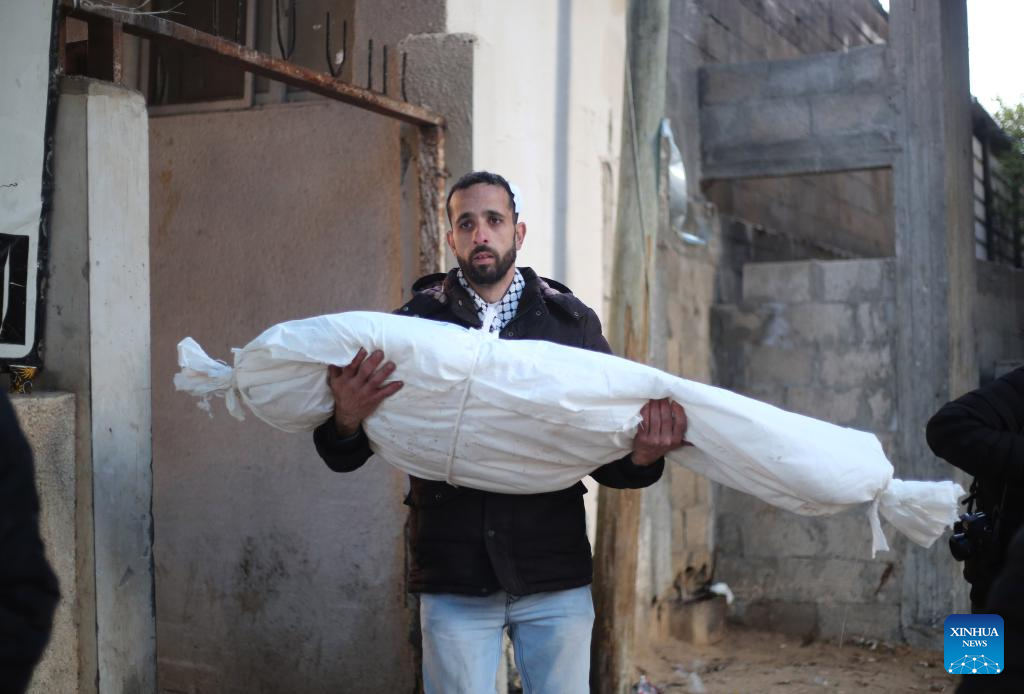 A Palestinian carries the body of a victim in the southern Gaza Strip city of Rafah, Feb. 3, 2024. In the early hours of Saturday, at least 24 Palestinians, including children and women, were killed as Israeli airstrikes and artillery bombardments struck houses in the Gazan cities of Deir al-Balah and Rafah, according to the official Palestinian news agency WAFA. (Photo by Khaled Omar/Xinhua)