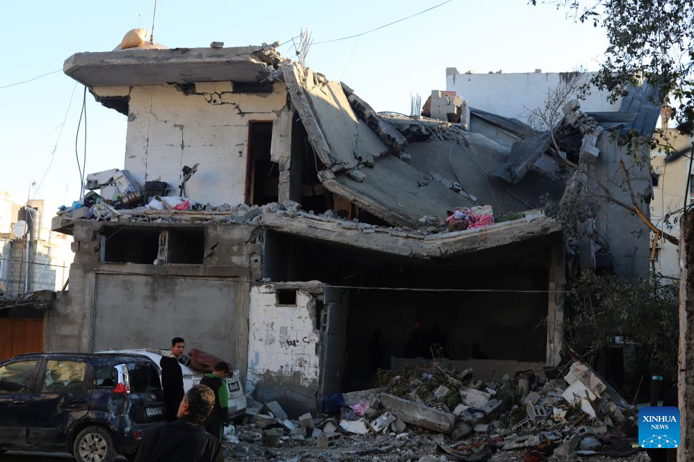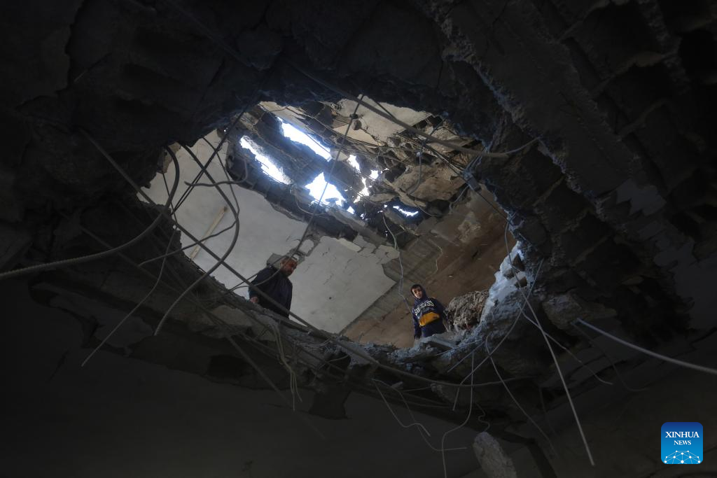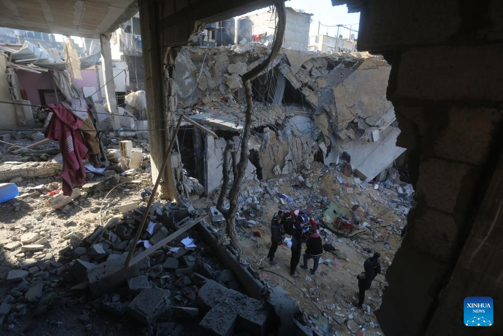 Palestinians inspect the debris of a building after Israeli airstrikes in the southern Gaza Strip city of Rafah, Feb. 3, 2024. In the early hours of Saturday, at least 24 Palestinians, including children and women, were killed as Israeli airstrikes and artillery bombardments struck houses in the Gazan cities of Deir al-Balah and Rafah, according to the official Palestinian news agency WAFA. (Photo by Khaled Omar/Xinhua)