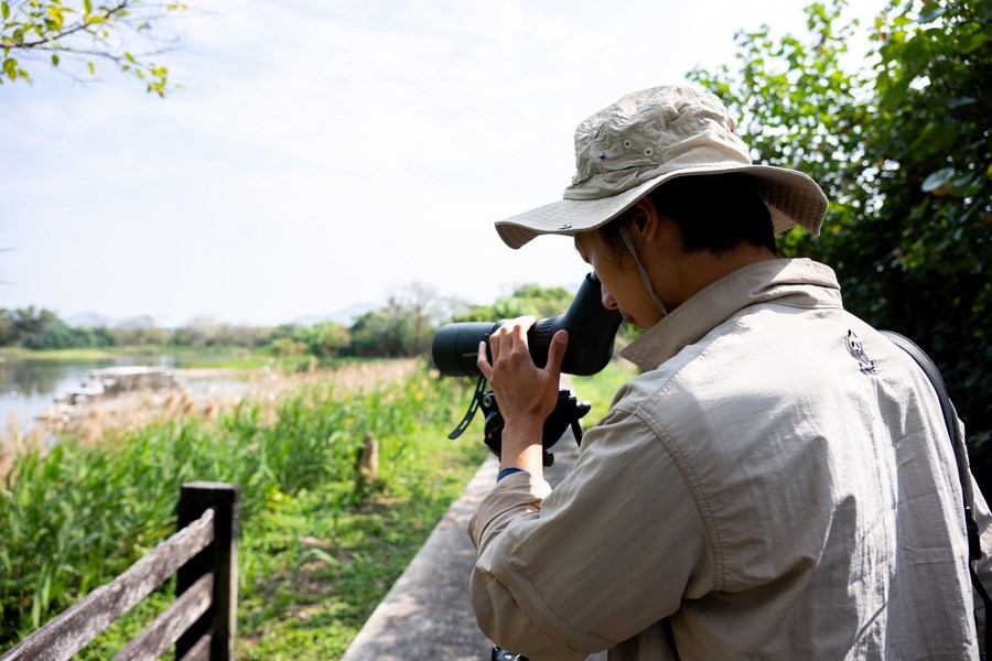 Photo taken on Jan. 11, 2024 shows a staff member observing birds in Mai Po Nature Reserve in Hong Kong, south China. (Xinhua/Zhu Wei)