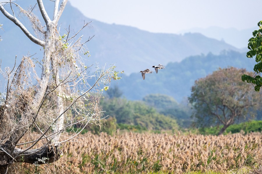 Photo taken on Jan. 11, 2024 shows birds flying in Mai Po Nature Reserve in Hong Kong, south China. (Xinhua/Zhu Wei)