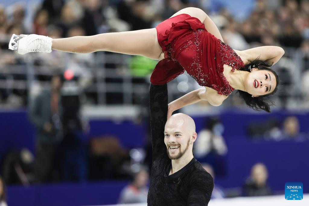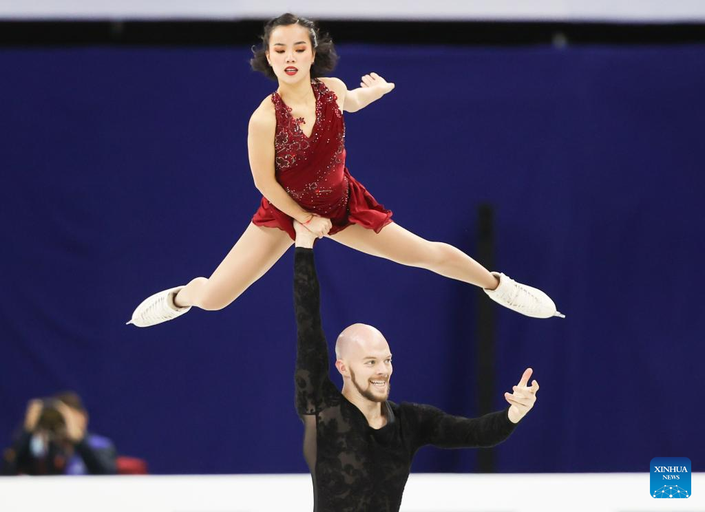 Ellie Kam (top)/Danny O'Shea of the United States perform during the pairs free skating of ISU Four Continents Figure Skating Championships 2024 in Shanghai, east China, Feb. 3, 2024. (Xinhua/Wang Xiang)