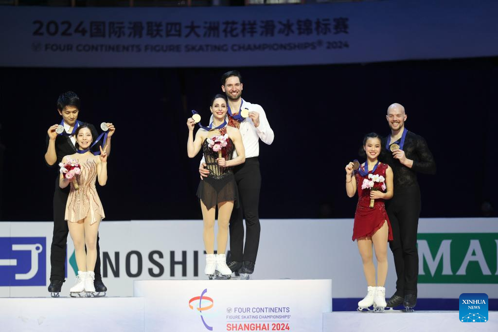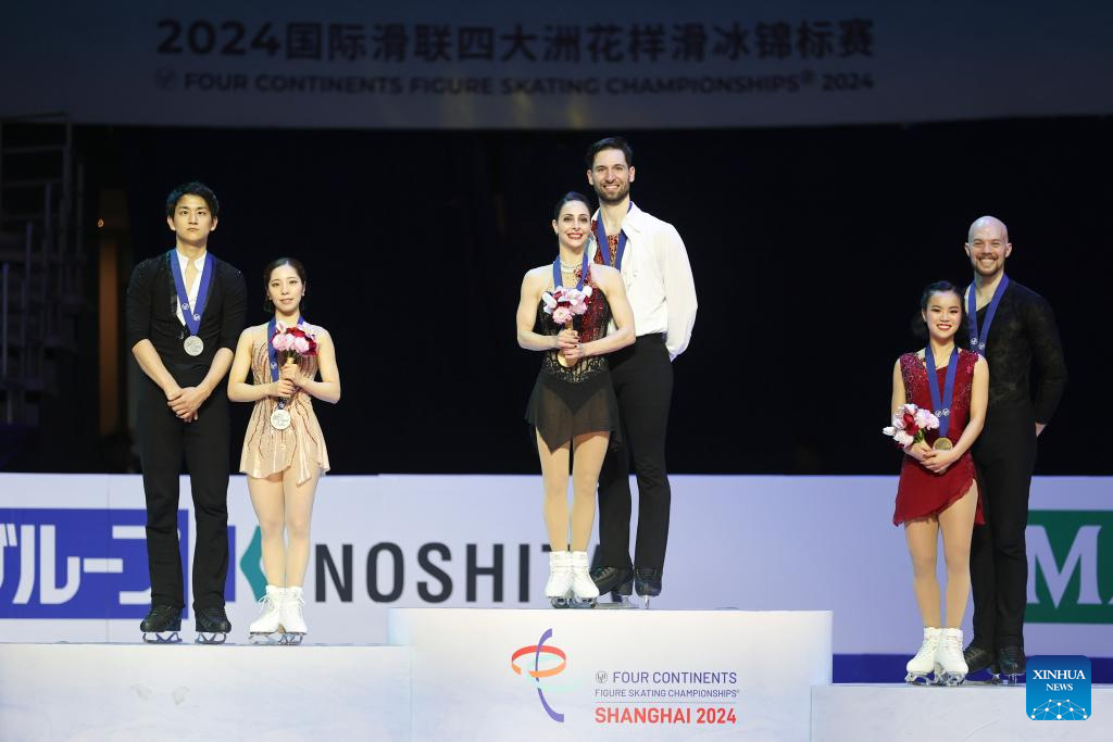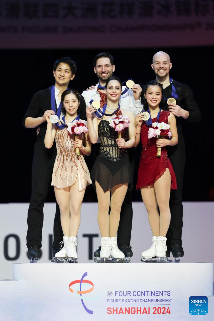 Gold medalists Deanna Stellato-Dudek (front C)/Maxime Deschamps (rear C) of Canada, silver medalists Miura Riku (front L)/Kihara Ryuichi (rear L) of Japan and bronze medalists Ellie Kam (front R)/Danny O'Shea of the United States pose during the awarding ceremony for the pairs skating event of ISU Four Continents Figure Skating Championships 2024 in Shanghai, east China, Feb. 3, 2024. (Xinhua/Wang Xiang)