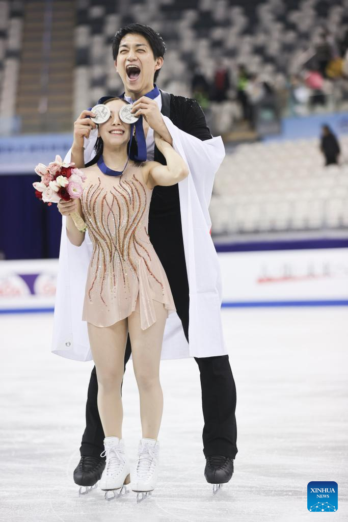 Silver medalists Miura Riku (L)/Kihara Ryuichi of Japan react after the awarding ceremony for the pairs skating event of ISU Four Continents Figure Skating Championships 2024 in Shanghai, east China, Feb. 3, 2024. (Xinhua/Wang Xiang)