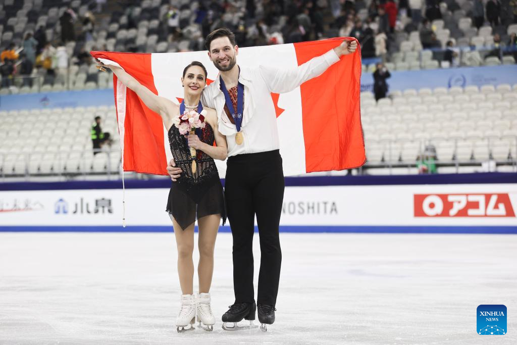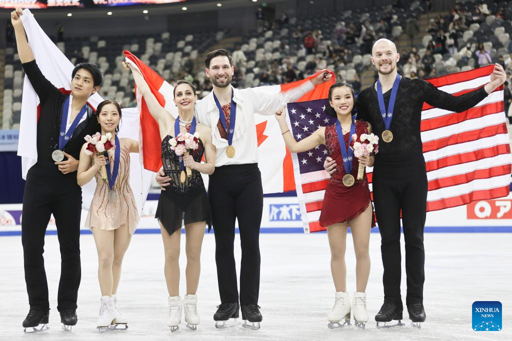 Gold medalists Deanna Stellato-Dudek (L)/Maxime Deschamps of Canada pose after the awarding ceremony for the pairs skating event of ISU Four Continents Figure Skating Championships 2024 in Shanghai, east China, Feb. 3, 2024. (Xinhua/Wang Xiang)