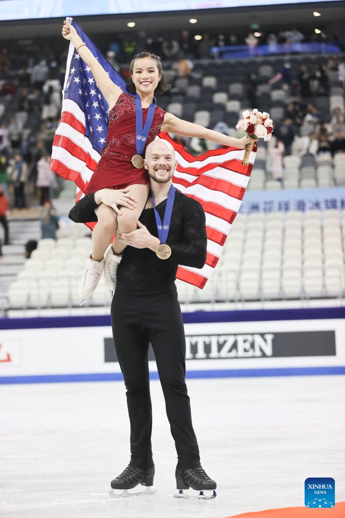 Bronze medalists Ellie Kam (top)/Danny O'Shea of the United States pose after the awarding ceremony for the pairs skating event of ISU Four Continents Figure Skating Championships 2024 in Shanghai, east China, Feb. 3, 2024. (Xinhua/Wang Xiang)