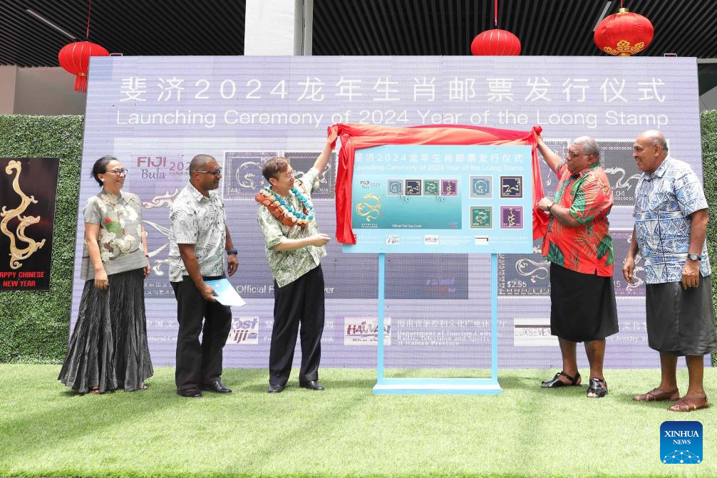Fijian President Ratu Wiliame Katonivere (2nd, R) and Ma Guoliang (3rd, L), commercial counselor of the Chinese embassy in Fiji, attend a launching ceremony for the Year of the Dragon stamps in Nausori, Fiji, Feb. 3, 2024. A launching ceremony was held here for the Year of the Dragon stamps on Saturday in celebration of the Chinese Lunar New Year, which falls on Feb. 10. (Photo by Sang Qinlong/Xinhua)