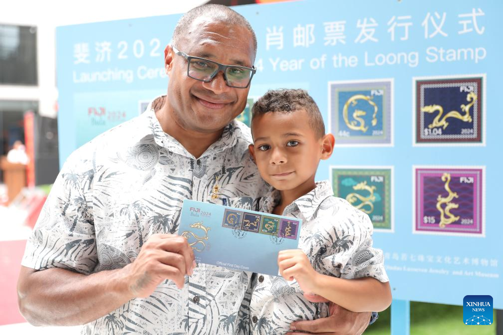 A man and his son show the Year of the Dragon stamps at a launching ceremony held in Nausori, Fiji, Feb. 3, 2024. A launching ceremony was held here for the Year of the Dragon stamps on Saturday in celebration of the Chinese Lunar New Year, which falls on Feb. 10. (Photo by Sang Qinlong/Xinhua)