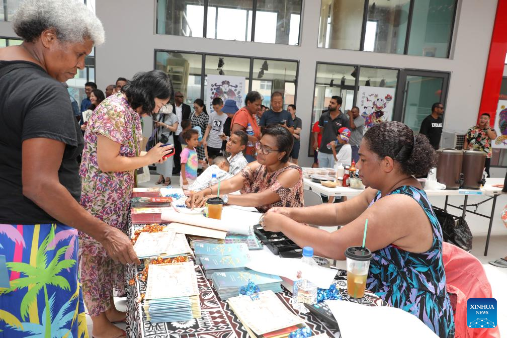 People buy the Year of the Dragon stamps at a launching ceremony held in Nausori, Fiji, Feb. 3, 2024. A launching ceremony was held here for the Year of the Dragon stamps on Saturday in celebration of the Chinese Lunar New Year, which falls on Feb. 10. (Photo by Sang Qinlong/Xinhua)