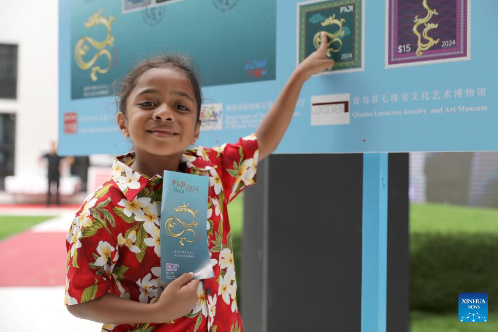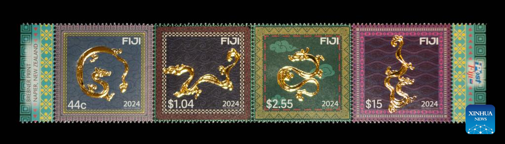 This photo taken on Feb. 3, 2024 shows a set of the Year of the Dragon stamps at a launching ceremony held in Nausori, Fiji. A launching ceremony was held here for the Year of the Dragon stamps on Saturday in celebration of the Chinese Lunar New Year, which falls on Feb. 10. (Photo by Sang Qinlong/Xinhua)