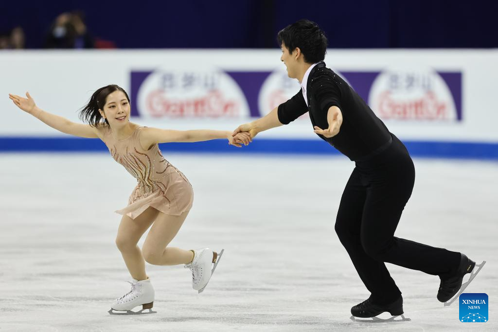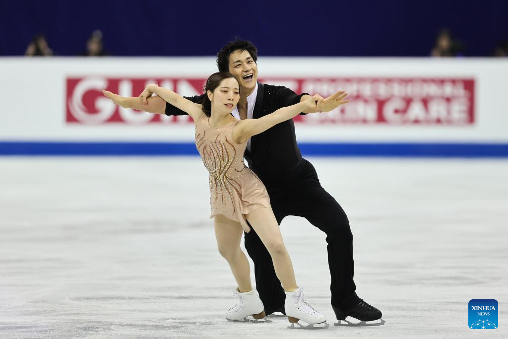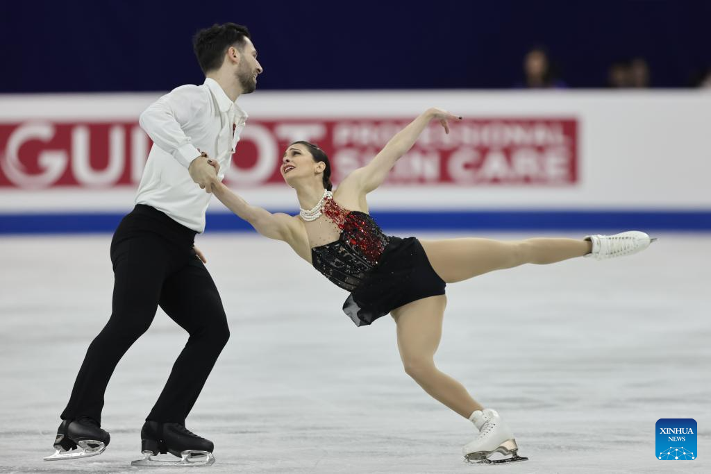 Deanna Stellato-Dudek (L)/Maxime Deschamps of Canada perform during the pairs free skating of ISU Four Continents Figure Skating Championships 2024 in Shanghai, east China, Feb. 3, 2024. (Xinhua/Wang Xiang)