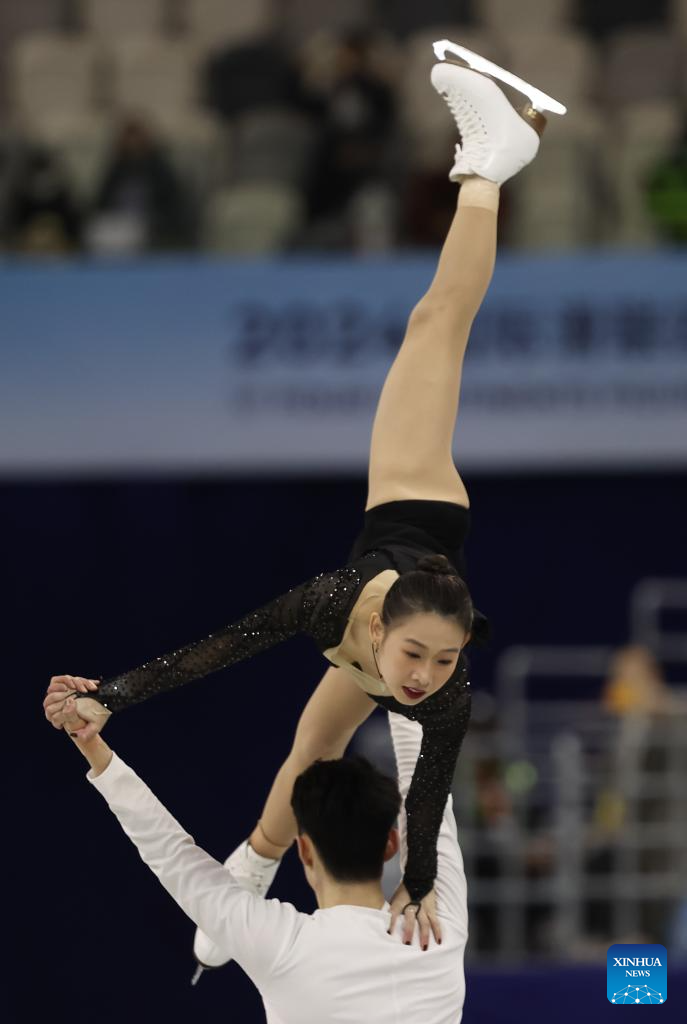 Peng Cheng (top)/Wang Lei of China perform during the pairs free skating of ISU Four Continents Figure Skating Championships 2024 in Shanghai, east China, Feb. 3, 2024. (Xinhua/Wang Xiang)