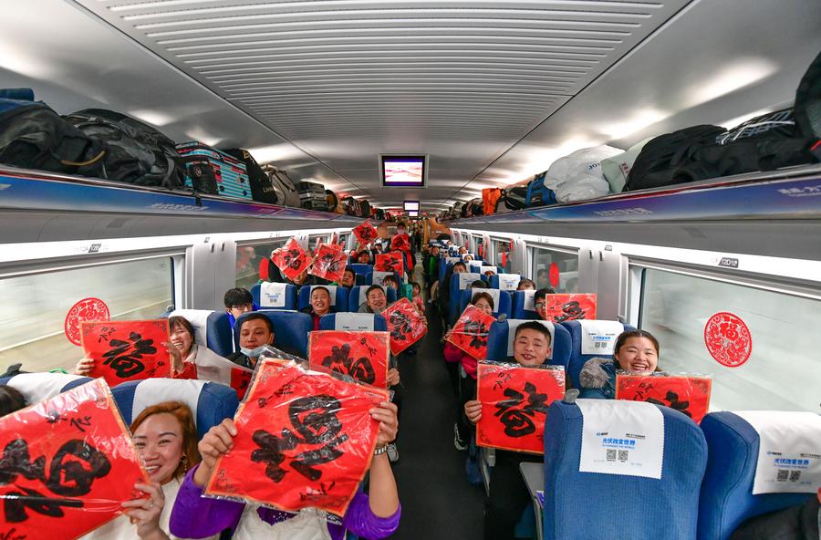 Passengers show the Chinese character "Fu", which means "good fortune", aboard the train G4835 on Feb. 1, 2024. (Xinhua/Yang Wenbin)