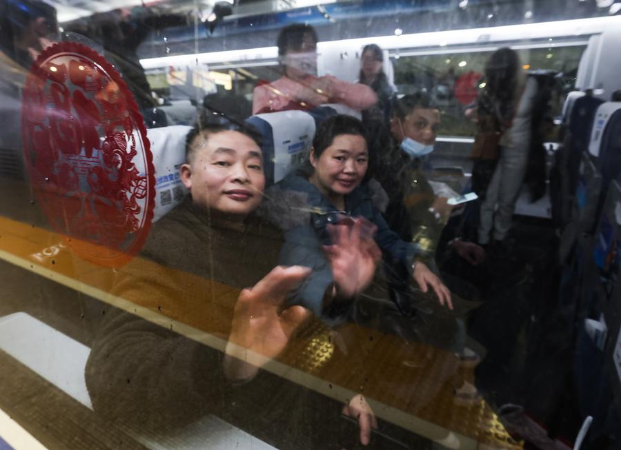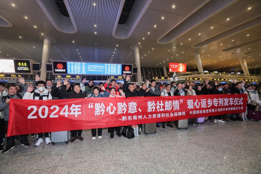Workers from Qiandongnan Miao and Dong Autonomous Prefecture of southwest China's Guizhou Province pose for a group photo before taking the train G4835 at Hangzhou East Railway Station in Hangzhou, east China's Zhejiang Province, Feb. 1, 2024. (Xinhua/Xu Yu)Min Deshui and Long Chunxiang bid farewell to staff members of Hangzhou East Railway Station in Hangzhou, east China's Zhejiang Province, Feb. 1, 2024. (Xinhua/Xu Yu)Min Deshui and Long Chunxiang take the train G4835 on Feb. 1, 2024. (Xinhua/Yang Wenbin)An aerial drone photo taken on Feb. 1, 2024 shows the train G4835 running on a railway bridge in Taipan Town, southwest China's Guizhou Province. (Photo by Wu Jibin/Xinhua)Min Deshui (2nd R) and Long Chunxiang (1st R) show the Chinese character "Fu", which means "good fortune", aboard the train G4835 on Feb. 1, 2024. (Xinhua/Yang Wenbin)Long Chunxiang (1st L) hugs her son in Ladong Village of Jinping County, southwest China's Guizhou Province, Feb. 1, 2024. (Xinhua/Yang Wenbin)Min Deshui (2nd L) and Long Chunxiang (4th L) pose for a family photo in Ladong Village of Jinping County, southwest China's Guizhou Province, Feb. 1, 2024. (Xinhua/Yang Wenbin)Min Deshui and Long Chunxiang prepare to dine with their family in Ladong Village of Jinping County, southwest China's Guizhou Province, Feb. 1, 2024. (Xinhua/Yang Wenbin)■