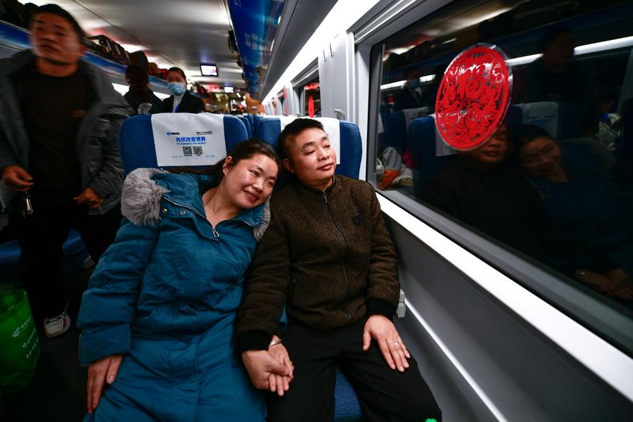 The couple on Thursday began their homecoming journey by taking the high-speed train G4835 from Hangzhou, capital of Zhejiang, to Kaili in Guizhou, which took them less than eight hours. After traveling over 1,500 kilometers by train, they took a car to their hometown in Ladong Village of Jinping County.