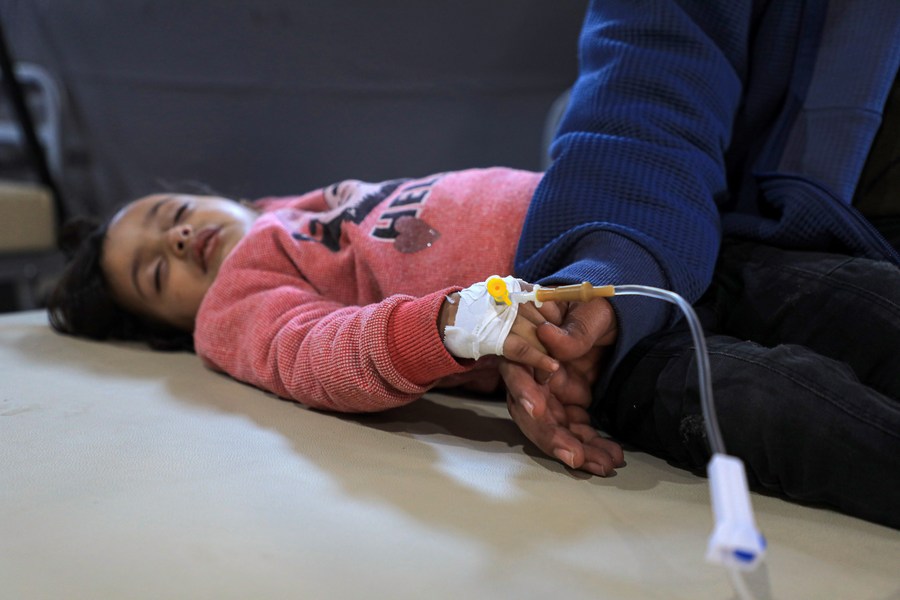 A child receives treatment at a temporary hospital in the southern Gaza Strip city of Rafah, on Jan. 25, 2024. (Photo by Rizek Abdeljawad/Xinhua)■