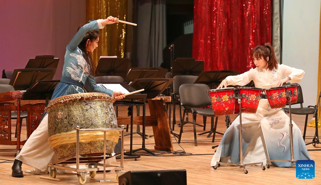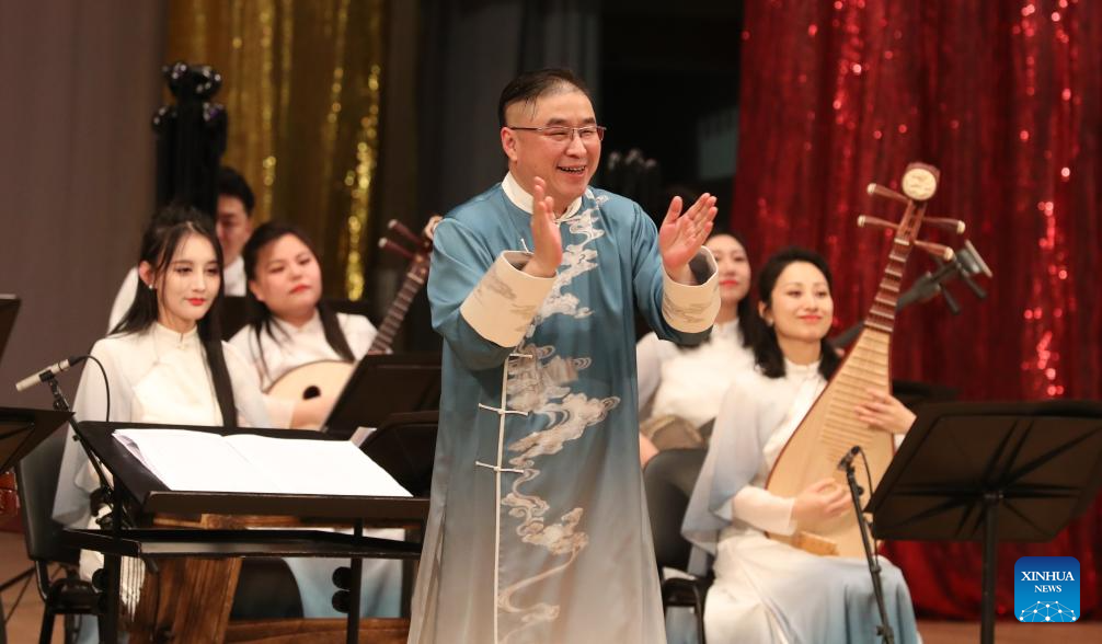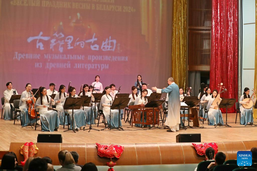 Artists stage the concert "Ancient Songs in Ancient Books" as part of the "Happy Chinese New Year" cultural event in Minsk, Belarus, Jan. 26, 2024. (Photo by Henadz Zhinkov/Xinhua)