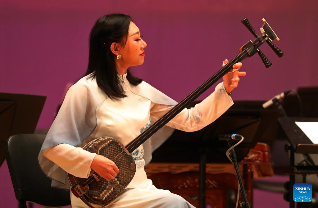 An artist stages the concert "Ancient Songs in Ancient Books" as part of the "Happy Chinese New Year" cultural event in Minsk, Belarus, Jan. 26, 2024. (Photo by Henadz Zhinkov/Xinhua)