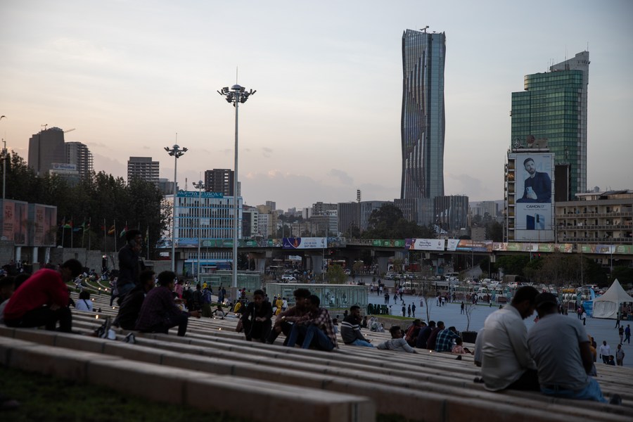 People are seen near the Commercial Bank of Ethiopia Headquarters in Addis Ababa, capital of Ethiopia, Feb. 13, 2022. (Xinhua/Michael Tewelde)