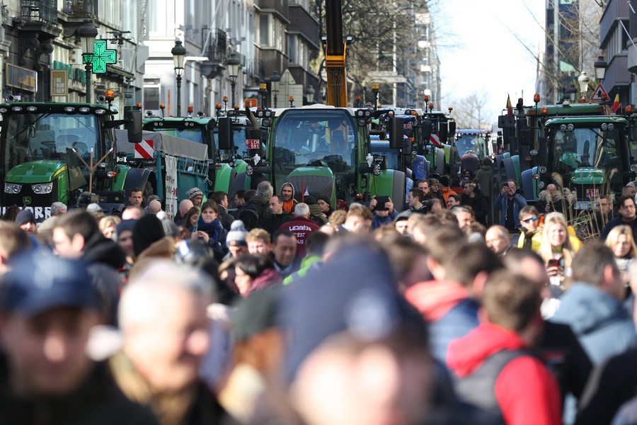 People take part in a protest in Brussels, Belgium, Feb. 1, 2024. (Xinhua/Zhao Dingzhe)