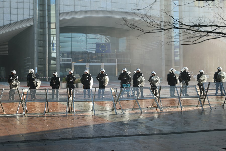BRUSSELS, Feb. 2 (Xinhua) -- The meeting of European Union (EU) leaders in Brussels on Thursday was accompanied by a demonstration of angry farmers who blocked the roads around the summit venue with some 1,000 tractors, protesting against rising costs and shrinking income.