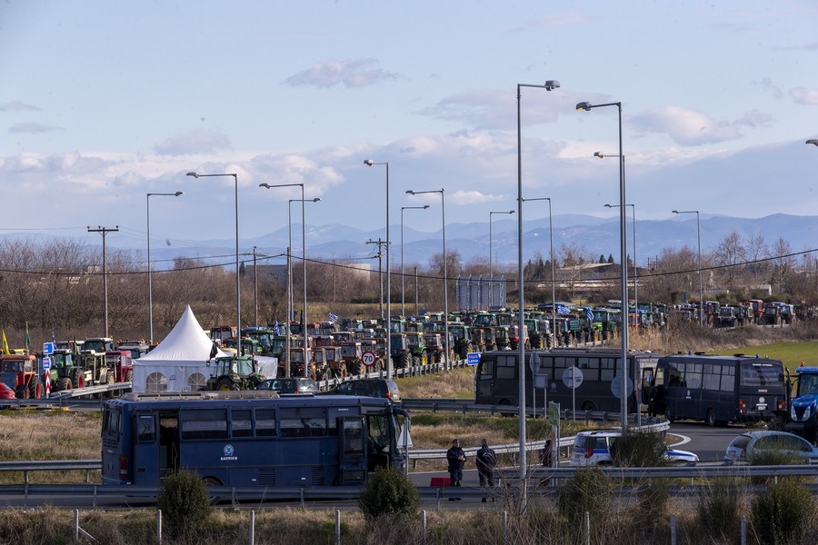 This photo taken on Jan. 30, 2024 shows farmers blocking highways with tractors during their protests near Karditsa, Greece. (Xinhua/Marios Lolos)