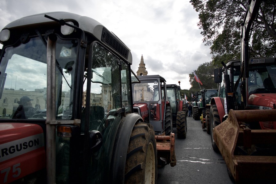 Tractors are seen in a protest in Floriana, Malta, on Feb. 2, 2024. (Photo by Jonathan Borg/Xinhua)