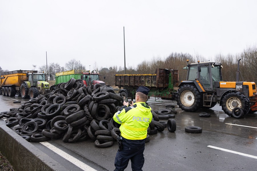 French farmers occupy and block the A1 motorway between Lille and Paris during a demonstration in Lesquin, northern France, Jan. 25, 2024. (Photo by Sebastien Courdji/Xinhua)