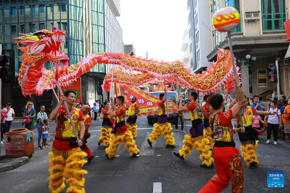 Performers stage a dragon dance during celebrations for the upcoming Chinese Lunar New Year in Port Louis, Mauritius, Feb. 3, 2024. (Chinese Embassy in Mauritius/Handout via Xinhua)