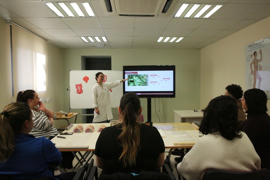 Wang Yimeng (Rear), a Chinese doctor from the Center for Traditional Chinese Medicine at the University of Malta, gives a lecture about moxa and moxibustion in Msida, Malta, on Feb. 1, 2024. (Xinhua/Chen Wenxian)