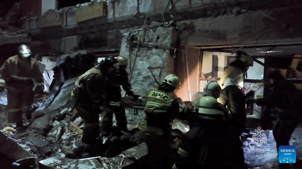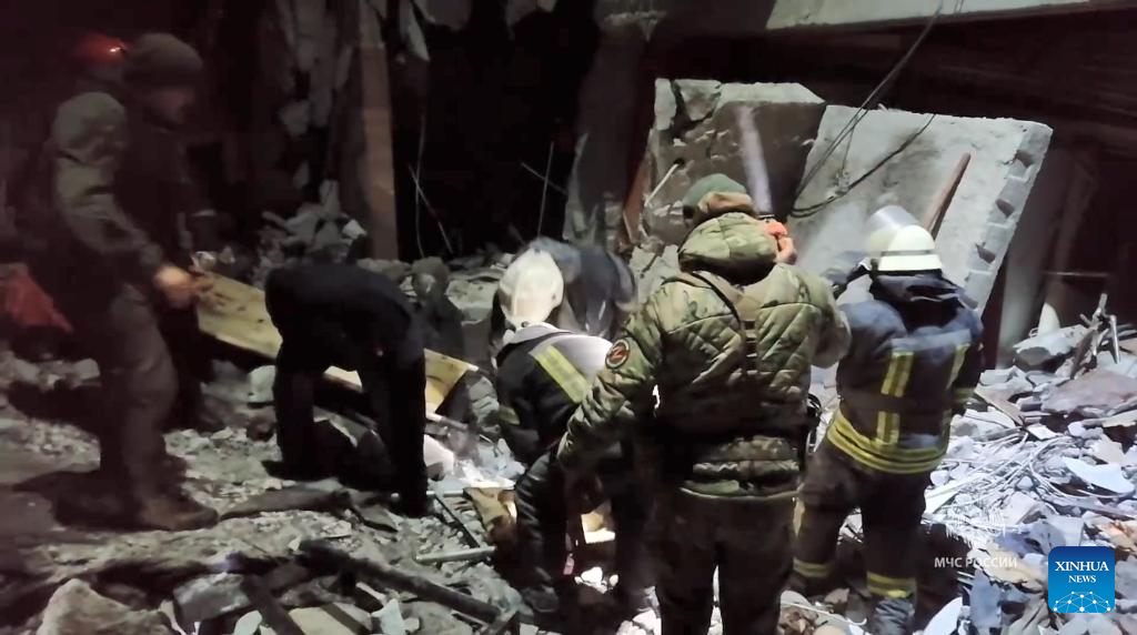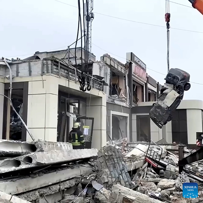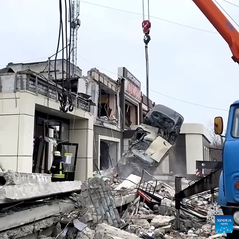 A video screenshot released by Russia's Ministry of Emergency Situations shows rescuers working at the site of shelling in the city of Lysychansk in the Lugansk region, Feb. 3, 2024. Seven people were killed after a bakery in the city of Lysychansk in the Lugansk region was reportedly shelled Saturday by the Armed Forces of Ukraine, according to Russia's TASS news agency. (Xinhua)