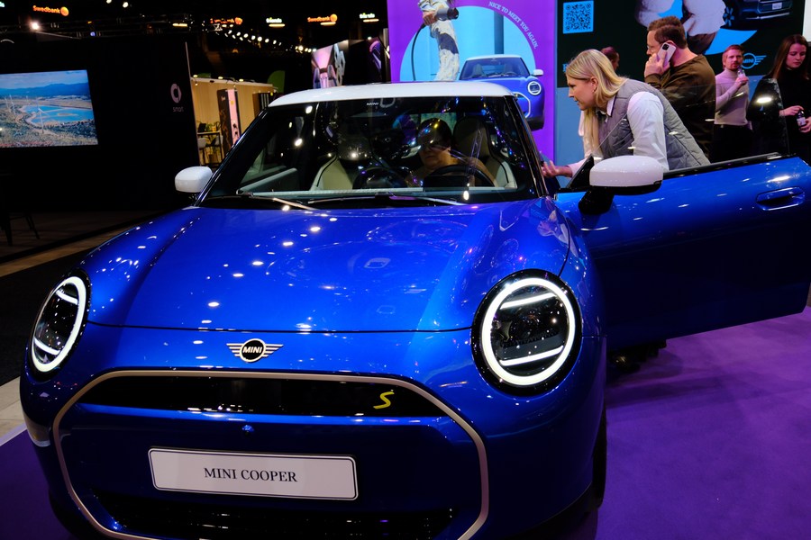 A visitor tries an electric vehicle of MINI COOPER at the Swedish eCarExpo 2024 in Stockholm, Sweden, on Feb. 2, 2024. (Photo by Patrick Ekstrand/Xinhua)