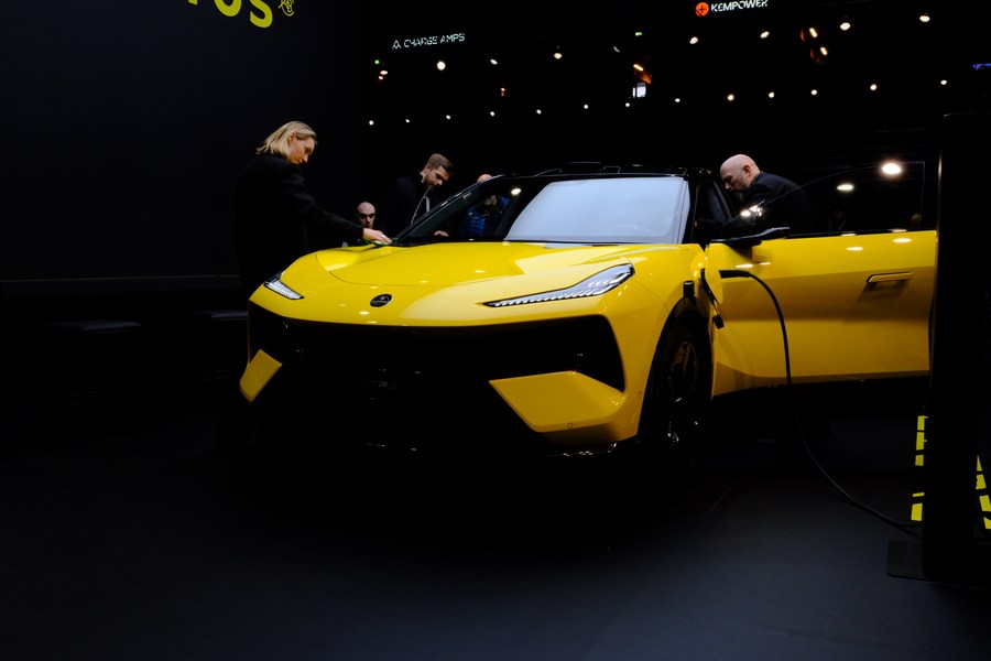 People look at an electric vehicle of LOTUS at the Swedish eCarExpo 2024 in Stockholm, Sweden, on Feb. 2, 2024. (Photo by Patrick Ekstrand/Xinhua)