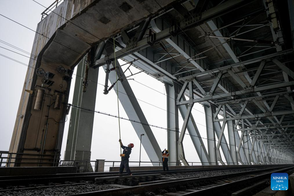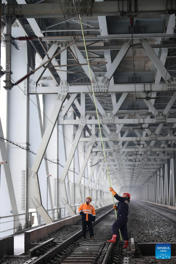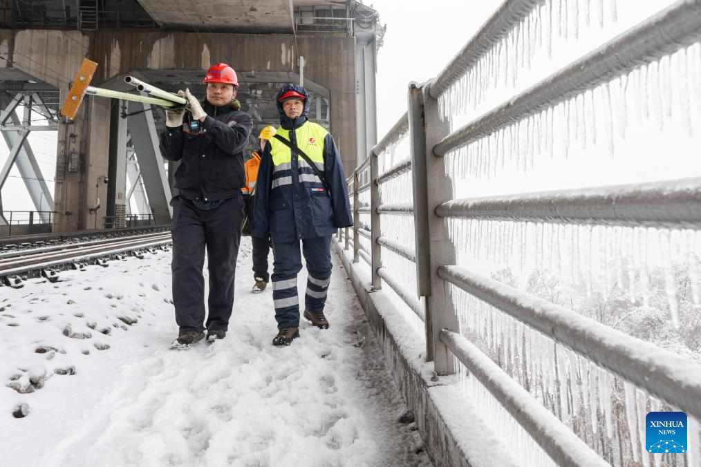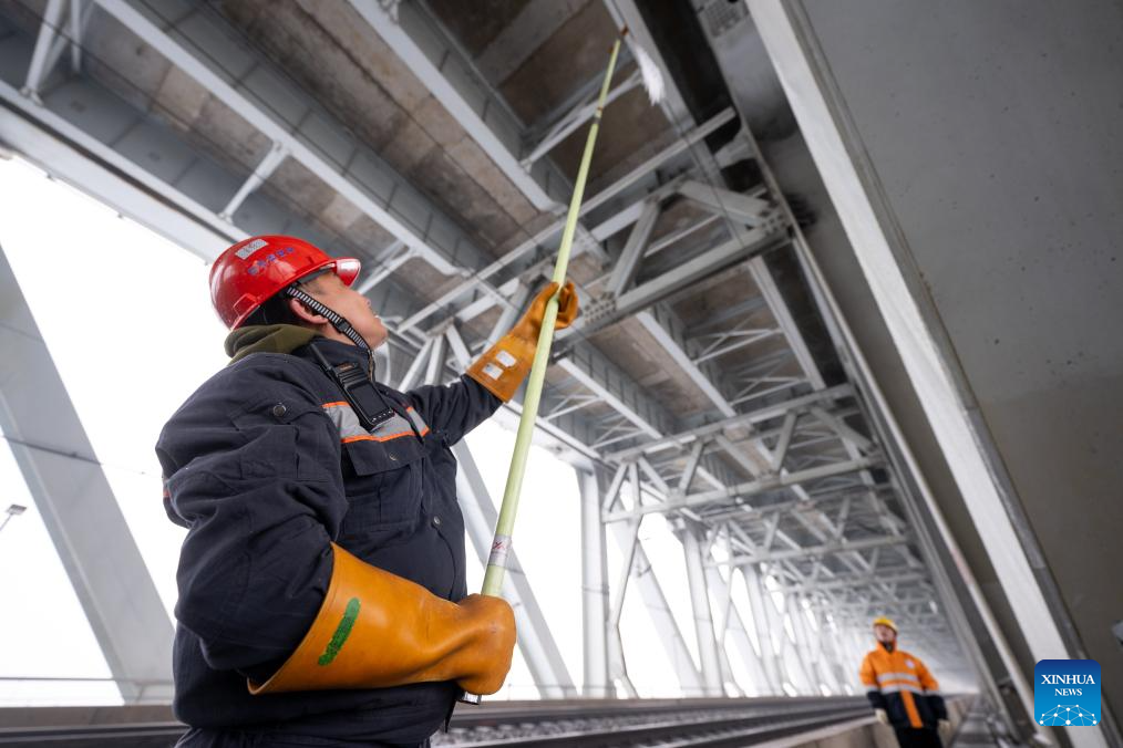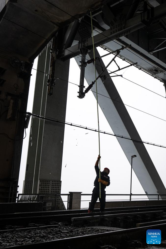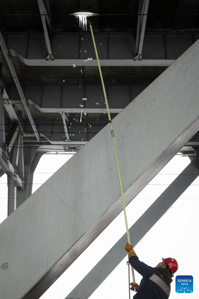 A staff member removes ice clad in the overhead catenary system on the Tianxingzhou bridge over the Yangtze River in Wuhan, central China's Hubei Province, Feb. 4, 2024. Heavy snowfall has enveloped some areas of central and eastern China since Wednesday, leading to transport disruption amid the ongoing Spring Festival travel rush.