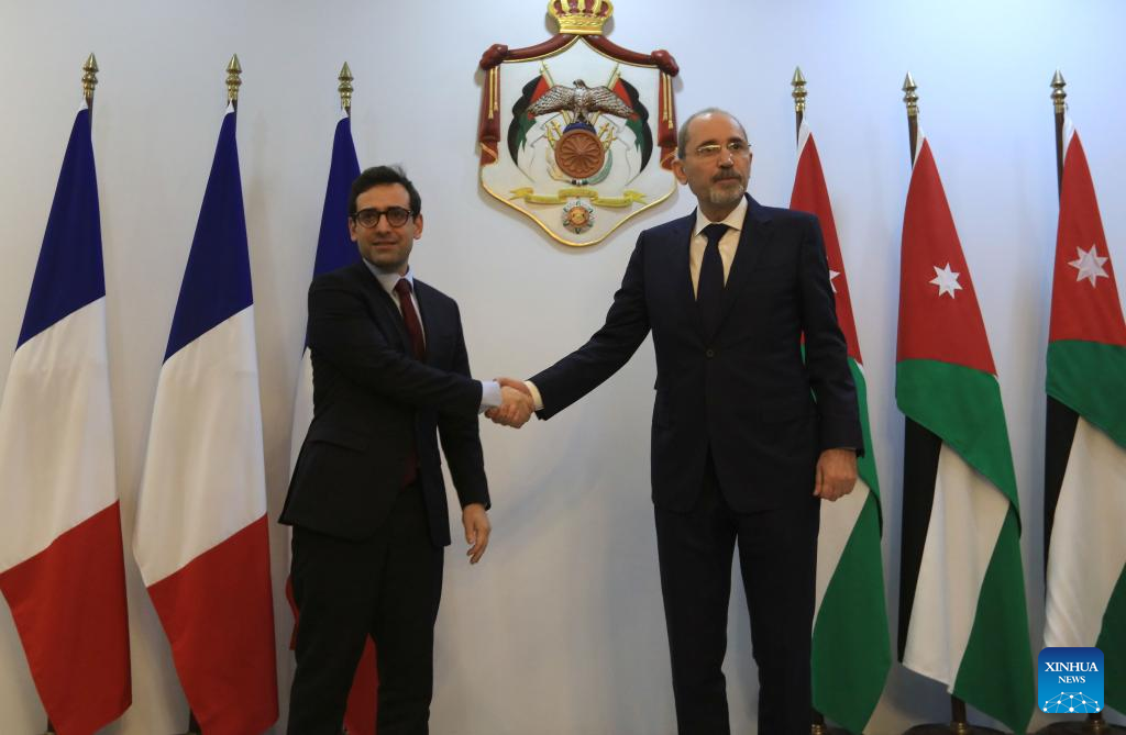 Jordanian Foreign Minister Ayman Safadi (R) meets with French Foreign Minister Stephane Sejourne in Amman, Jordan, Feb. 4, 2024. (Photo by Mohammad Abu Ghosh/Xinhua)