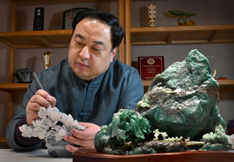 Liu Xiaoqiang, a 51-year-old jade carver, is a provincial-level intangible cultural heritage inheritor of Zhenping jade carving art, acknowledged in 2021. Many of his works are displayed at the exhibition room of his studio, including finely carved landscapes, lifelike flowers and birds, and witty figurines, each with a unique style.