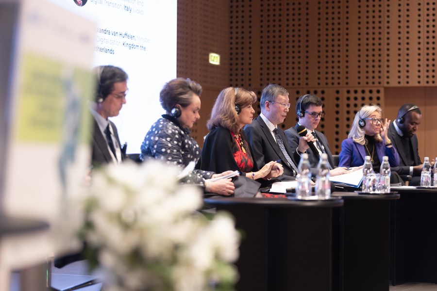 China's Vice Minister of Education Wang Jiayi speaks at the second Global Forum on the Ethics of AI in Kranj, Slovenia, Feb. 5, 2024. (Photo by Zeljko Stevanic/Xinhua)