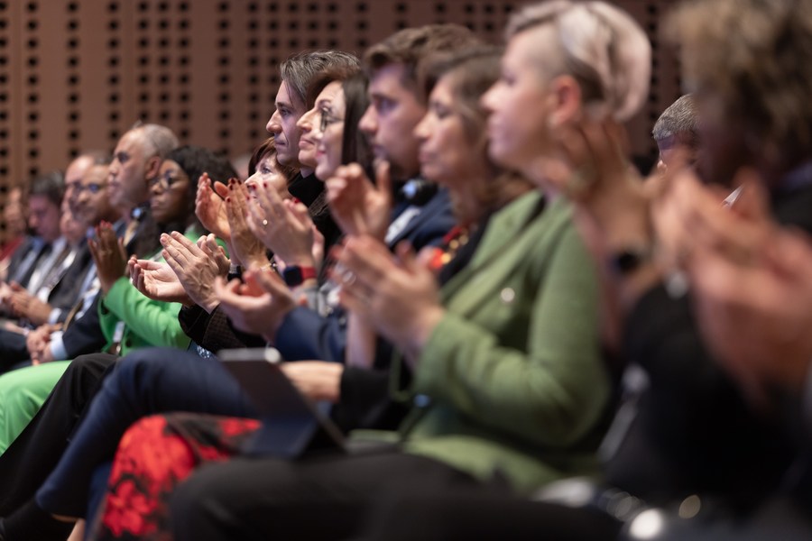 Guests attend the second Global Forum on the Ethics of AI in Kranj, Slovenia, Feb. 5, 2024. (Photo by Zeljko Stevanic/Xinhua)
