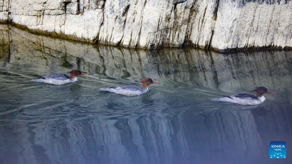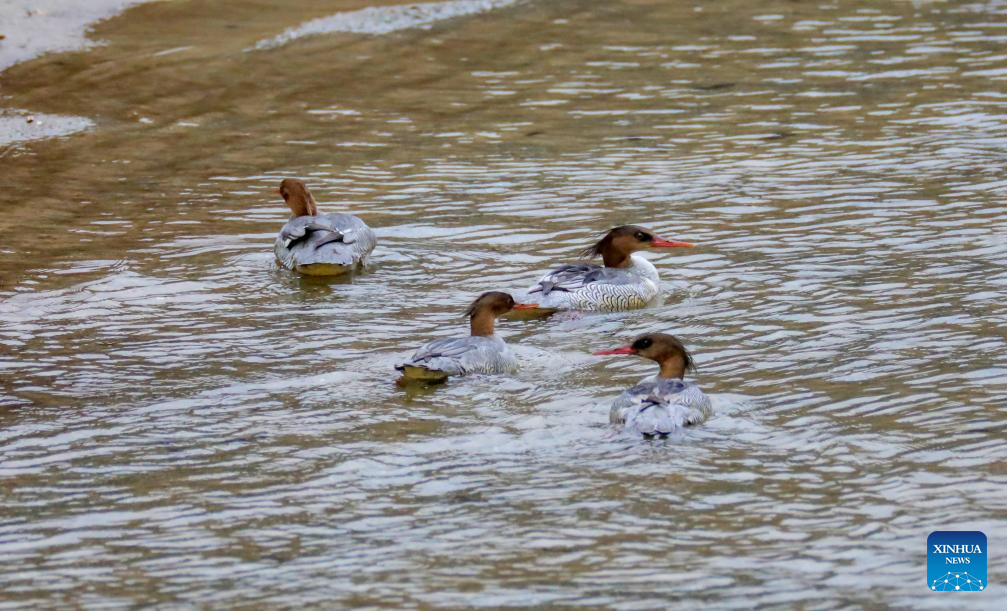 LANZHOU, Feb. 6 (Xinhua) -- Chinese mergansers, an endangered species of duck, were captured by cameras in the Baishuijiang National Nature Reserve in northwest China's Gansu Province recently, which is the first documented sighting of the species in the reserve.