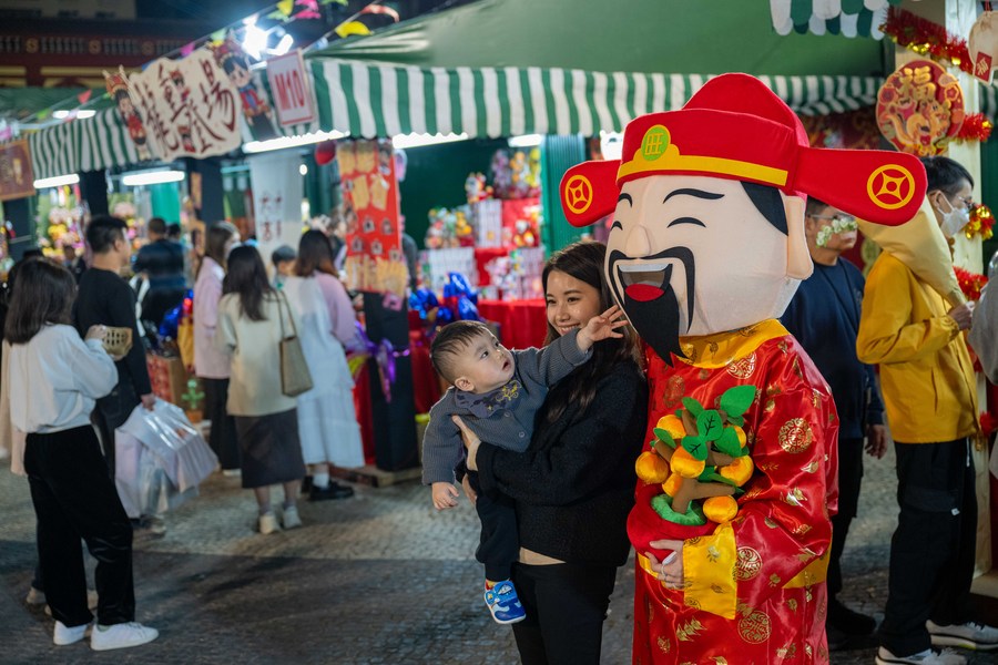 Citizens pose for photos with a staff member in the costume of the God of Wealth at the 2024 Chinese Lunar New Year market at Tap Seac Square in south China's Macao, Feb. 4, 2024. (Xinhua/Cheong Kam Ka)