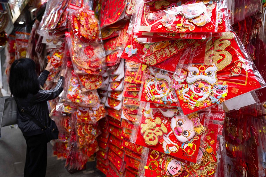 A citizen selects Spring Festival decorations in south China's Macao, Feb. 5, 2024. (Xinhua/Cheong Kam Ka)