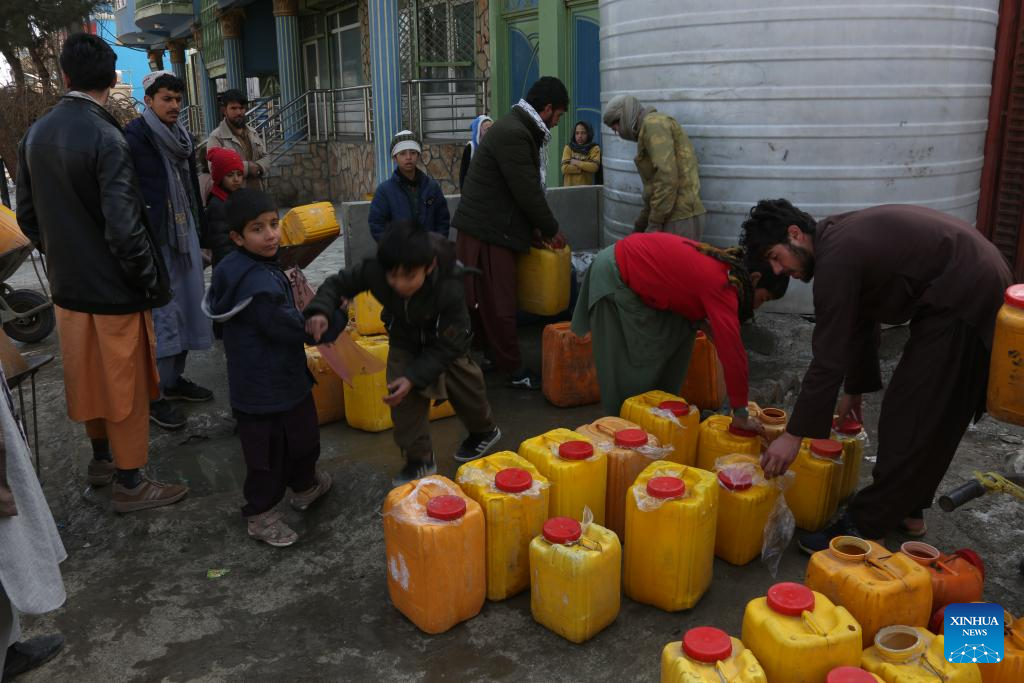 People get water in Kabul, the capital of Afghanistan, Feb. 8, 2024. Climate change and frequent years of drought have deprived 21 million Afghans, almost half of Afghanistan's population, of access to potable water, Deputy Head of National Environment Program Agency (NEPA) Abdul Salam Haqqani said.