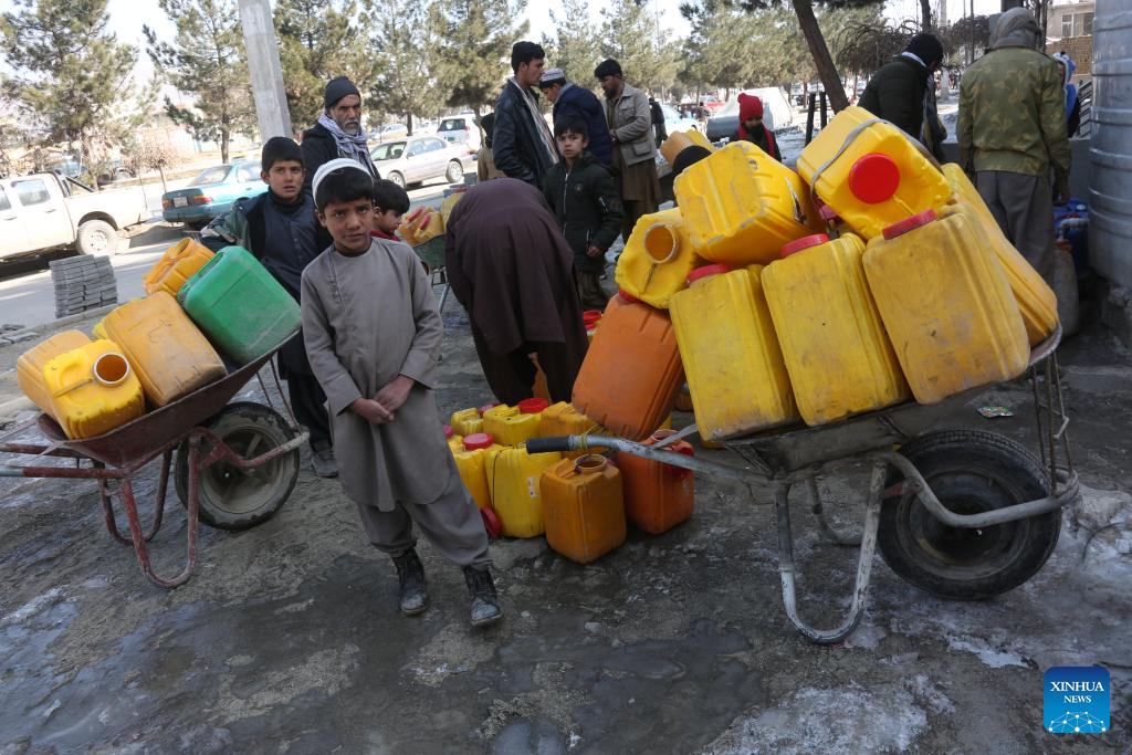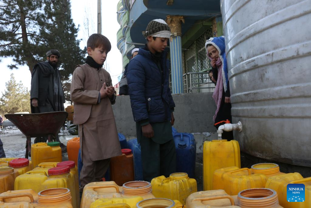Afghan children fetch water in Kabul, the capital of Afghanistan, Feb. 8, 2024. Climate change and frequent years of drought have deprived 21 million Afghans, almost half of Afghanistan's population, of access to potable water, Deputy Head of National Environment Program Agency (NEPA) Abdul Salam Haqqani said.