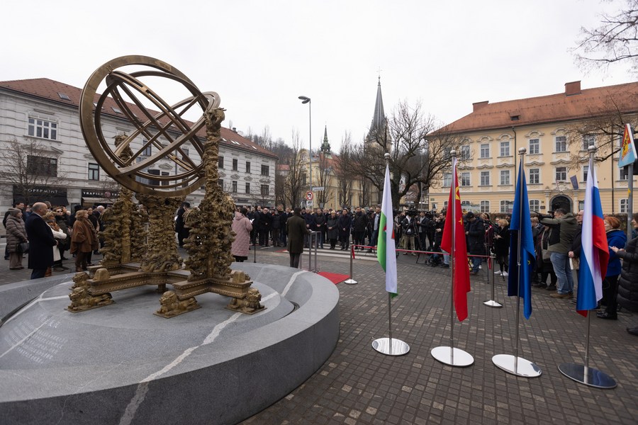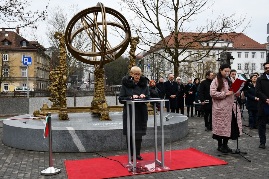 Slovenian President Natasa Pirc Musar, Chinese Ambassador to Slovenia Wang Shunqing, and Ljubljana Mayor Zoran Jankovic attended the inauguration ceremony on Tuesday in front of the Slovenian Archives building on the bank of Ljubljanica River, which runs through the capital.