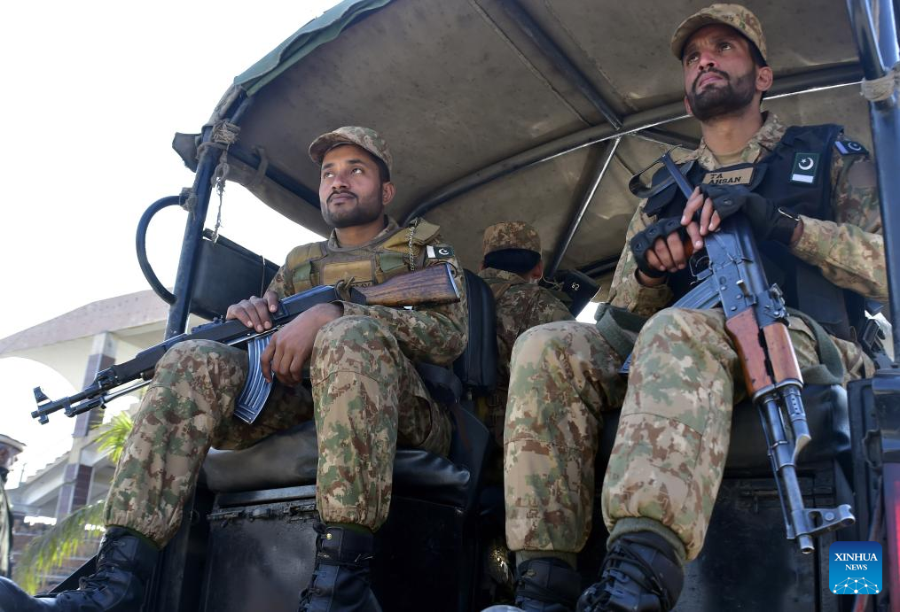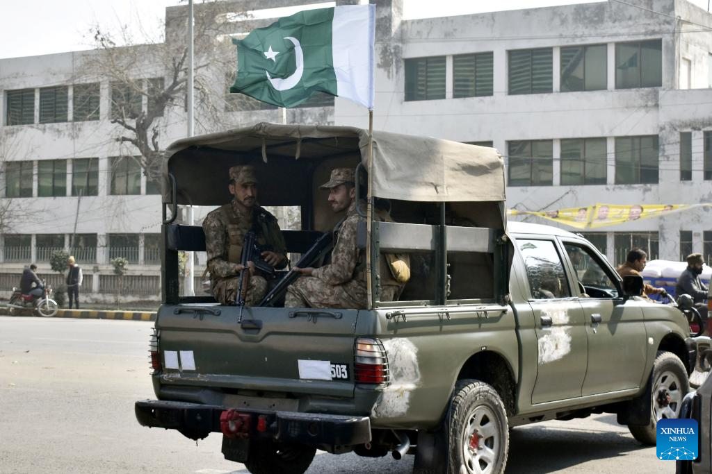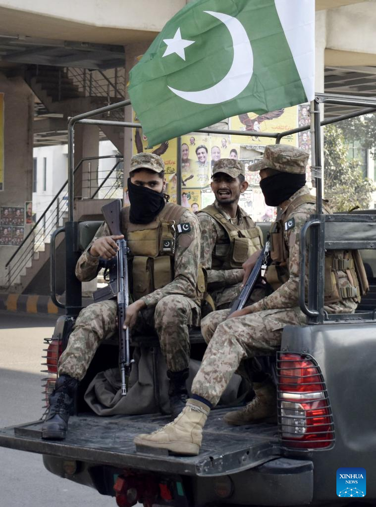 Pakistani security personnel are seen ahead of Pakistan's general elections in Lahore, Pakistan, on Feb. 7, 2024. Just a day before Pakistan's general elections, two powerful explosions hit election campaign offices in the country's southwest Balochistan province on Wednesday, killing at least 26 people while injuring over 45 others, said police and hospital officials. (Photo by Sajjad/Xinhua)