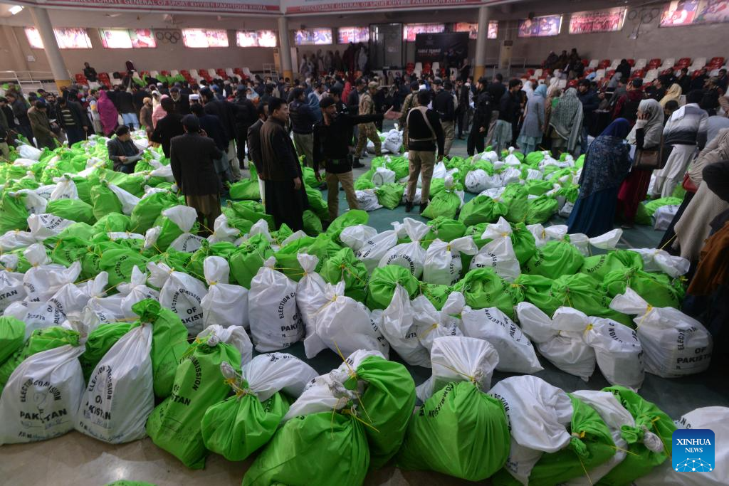Election staff collect voting materials at a distribution center in Peshawar, northwestern Pakistan, on Feb. 7, 2024. Just a day before Pakistan's general elections, two powerful explosions hit election campaign offices in the country's southwest Balochistan province on Wednesday, killing at least 26 people while injuring over 45 others, said police and hospital officials. (Photo by Umar Qayyum/Xinhua)