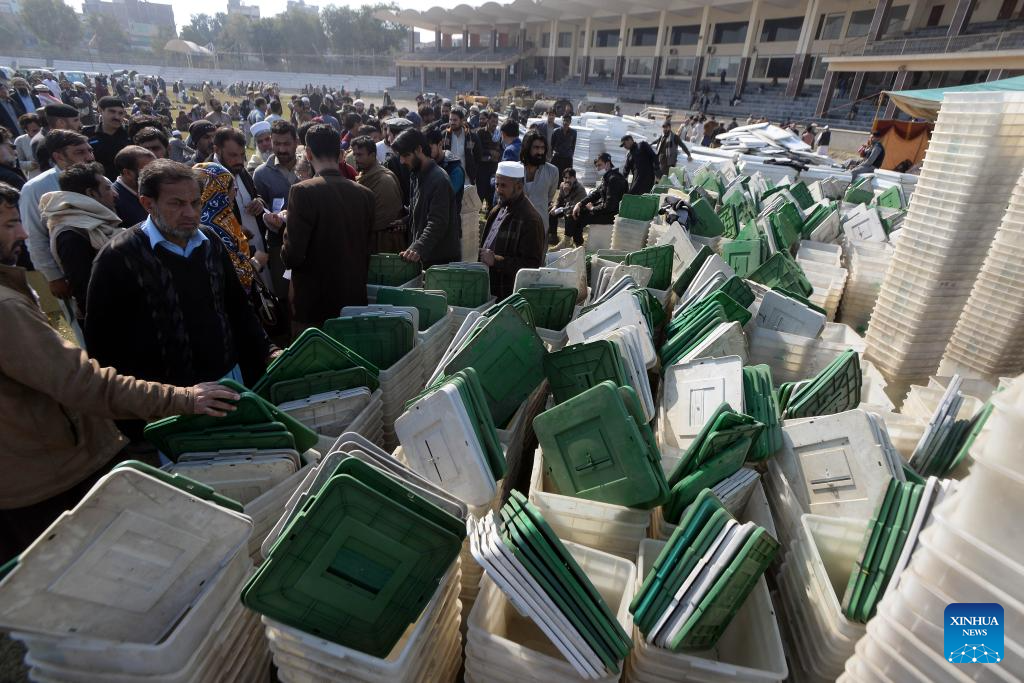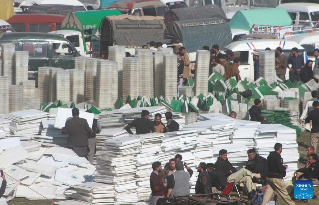 Election staff collect voting materials at a distribution center in Peshawar, northwestern Pakistan, on Feb. 7, 2024. Just a day before Pakistan's general elections, two powerful explosions hit election campaign offices in the country's southwest Balochistan province on Wednesday, killing at least 26 people while injuring over 45 others, said police and hospital officials. (Photo by Saeed Ahmad/Xinhua)