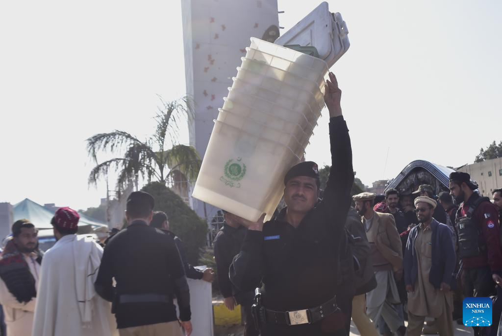 A policeman collects voting materials at a distribution center in Peshawar, northwestern Pakistan, on Feb. 7, 2024. Just a day before Pakistan's general elections, two powerful explosions hit election campaign offices in the country's southwest Balochistan province on Wednesday, killing at least 26 people while injuring over 45 others, said police and hospital officials. (Photo by Saeed Ahmad/Xinhua)