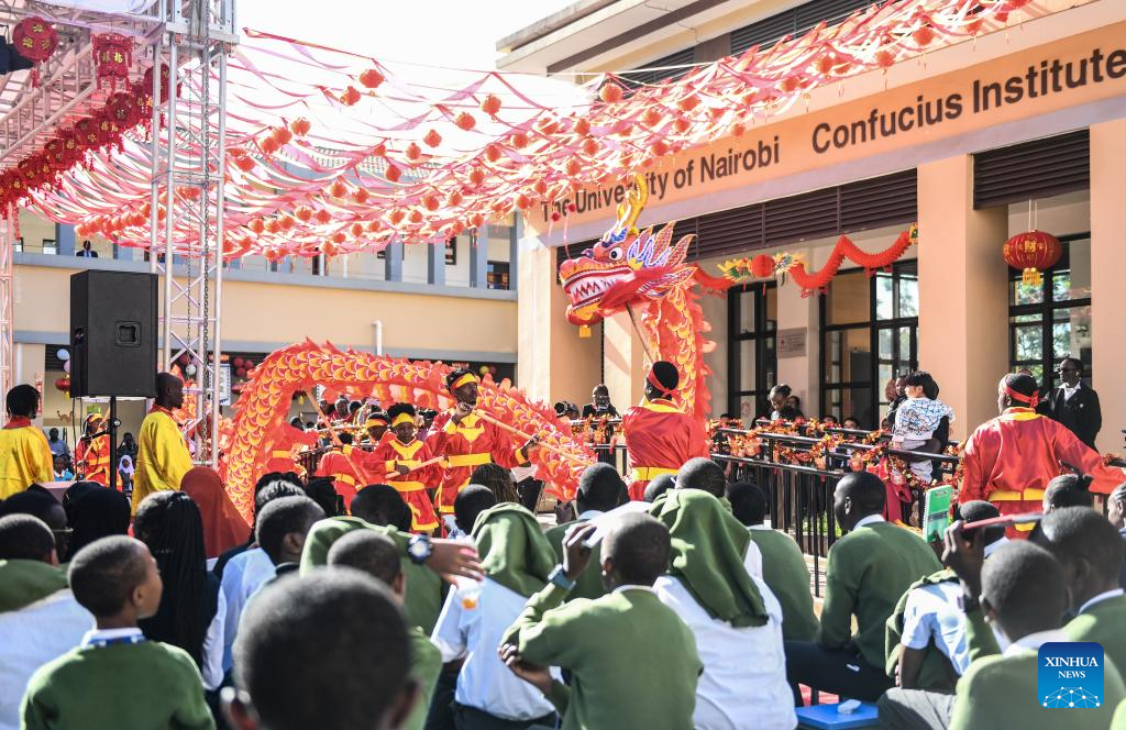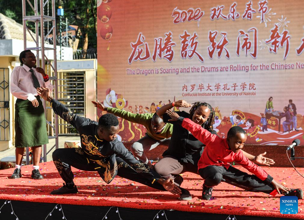 This photo taken on Feb. 7, 2024 shows people presenting Chinese Kungfu during a Chinese New Year celebration event in Nairobi, Kenya.