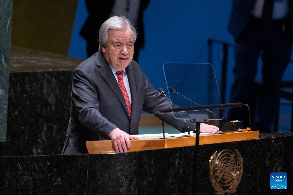 UN Secretary-General Antonio Guterres addresses the UN General Assembly with a list of priority areas for action at the UN headquarters in New York on Feb. 7, 2024. (Eskinder Debebe/UN Photo/Handout via Xinhua)